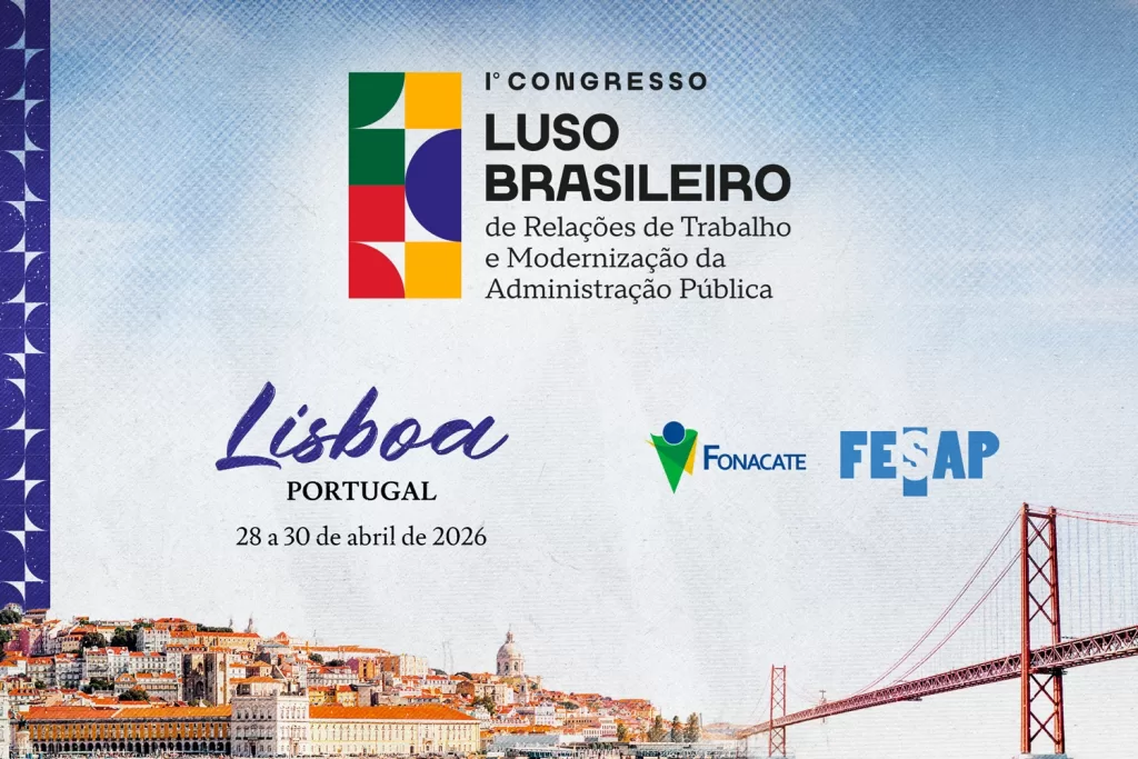 O Fórum Nacional Permanente de Carreiras Típicas de Estado (FONACATE), entidade de classe do Brasil, e a Federação de Sindicatos da Administração Pública (FESAP), entidade de classe de Portugal, promovem o 1º Congresso Luso-Brasileiro de Relações do Trabalho e Modernização da Administração Pública, que será realizado de 28 a 30 de abril de 2026, em Lisboa/Portugal, na sede da União Geral de Trabalhadores (UGT).